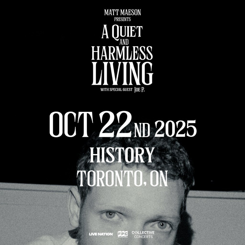 Matt Maeson @ History Where History, Toronto Map When Oct 22/25 07:00 PM - Oct 23/25 11:00 PM Age All Website https://www.ticketmaster.ca/matt-maeson-a-quiet-harmless-living-toronto-ontario-10-22-2025/event/100062C4E2265268 Matt Maeson – A Quiet & Harmless Living Tour Wednesday, October 22nd @ History DOORS: 6:00 PM SHOW: 7:00 PM SUPPORT: Joe P