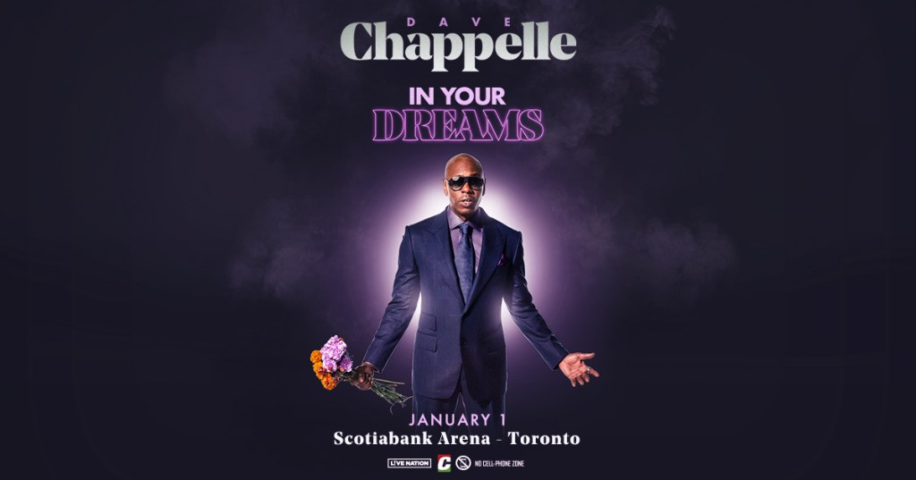 Dave Chappelle: In Your Dreams Where Scotiabank Arena , 40 Bay St, Toronto, ON, M5J 2X2 Map When Jan 01/23 07:00 PM - Jan 01/23 11:59 PM Age 19+ Website https://www.ticketmaster.ca/dave-chappelle-tickets/artist/803682 Dave Chappelle In Your Dreams Tour Sunday January 1st Scotiabank Arena