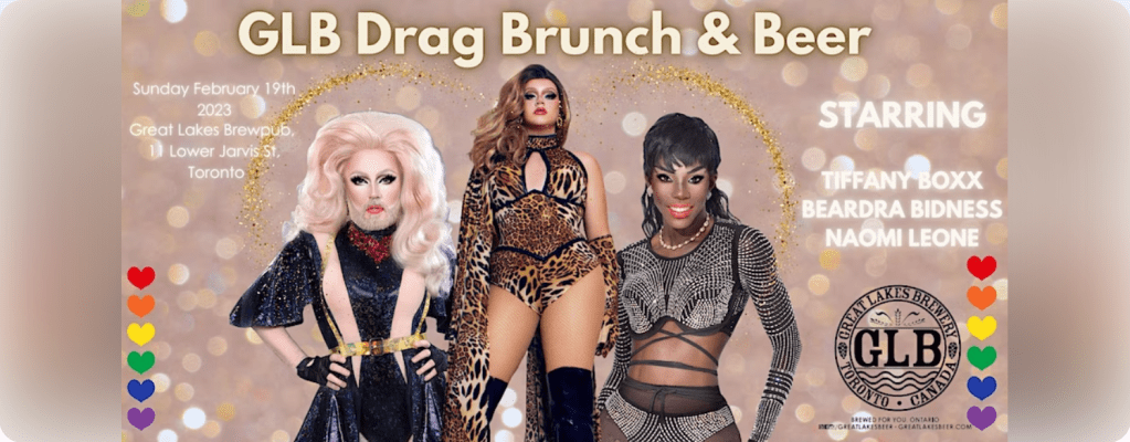 “Come join us for Drag Brunch This Sunday at GLB Brewpub at 11 Lower Jarvis Street! 3 queens, delicious beer, and a top notch food menu. If you can’t make it out to the Downtown Location you can always swing by GLB Etobicoke at 30 Queen Elizabeth Blvd, or Order Online for #FreshGLB Home Delivery Next Day, 7 days a week in the GTA.”