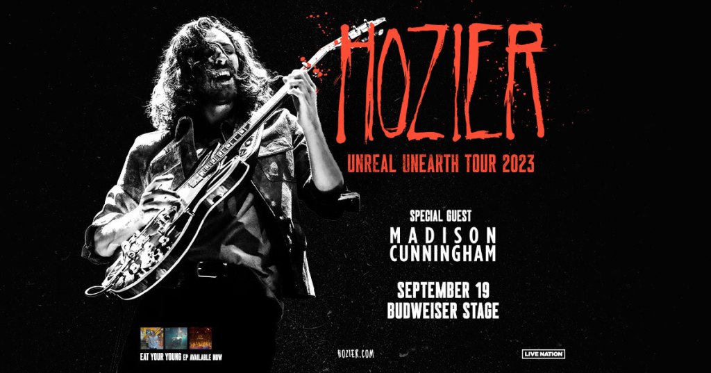 HOZIER: Unreal Tour 2023 Where Budweiser Stage, 909 Lake Shore Blvd W, Toronto, ON, M6K 3L3 Map When Sep 19/23 05:00 PM - Sep 19/23 11:59 PM Age 12+ year Website https://www.ticketmaster.ca/event/10005E6F0A3C50E3 HOZIER Unreal Unearth Tour 2023 with Madison Cunningham Tuesday September 19th 2023 Budweiser Stage