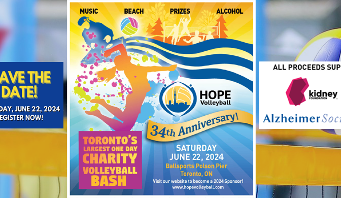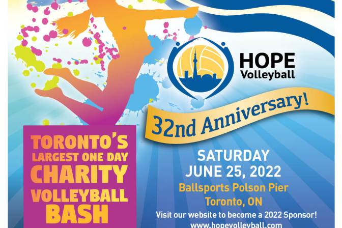 Ballsports Polson Pier, 176 Cherry St, Toronto, ON, M5A 3L2, Canada 32nd Annual HOPE Charity Volleyball Bash Join Toronto’s largest one day volleyball bash. High energy! Great Music! Prizes and more! 1 Day, 2 Causes Saturday, June 25, 2022 @ Ballsports Polson Pier. Register your team on-line today @ www.hopevolleyball.com. Spots are filling up quickly. First come-first serve! For more info: please visit us at www.hopevolleyball.com or email info@hopevolleyball.com. Proceeds support charities: Lupus […]