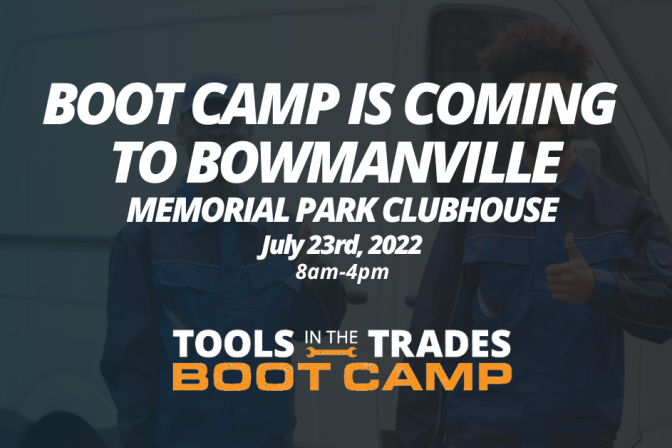 Memorial Park Clubhouse, 120 Liberty St S, Bowmanville, ON, L1C 2P4, Canada The Tools in the Trades Boot Camp is coming to Memorial Park Clubhouse in Bowmanville on July 23rd. This event is for anyone not currently enrolled in full-time education and is interested in the trades, and it’s FREE! Spots are limited. Apply today! Network with industry professionals, gain hands-on training and knowledge, and receive a […]