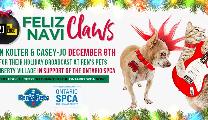 Ren's Pets Liberty Village, 99 Atlantic Ave, Toronto, Ontario , M6K 3J8, Canada The Edge’s Feliz Navi Claws is coming to Ren’s Pets in Liberty Village! Friday, December 9th 3pm-7pm …with your hosts Kolter and Meredith in support of the Ontario SPCA! You can make it possible for the Ontario SPCA and Humane Society to help tens of thousands of animals in need this holiday season. Pack up […]